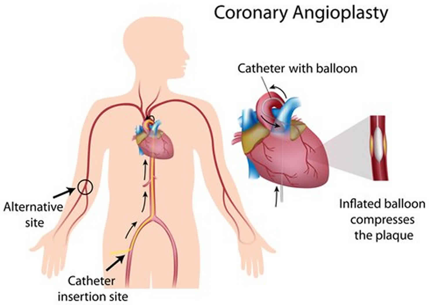 Local anesthesia is used for the procedure of angioplasty. X-rays are taken and a dye is injected into the body to observe the flow of blood through the arteries. Your surgeon will use these X-ray images to insert a thin guide wire through a blood vessel in your groin and use a small needle to extend it up to the blocked artery. The narrow tube known as a balloon catheter is then inserted through the guide wire into the blocked artery. At the tip of the balloon catheter, a deflated balloon is inflated at the site of the blockage. By pressing the plaque against the artery's wall, the balloon makes the artery wider. Along with the balloon catheter, your surgeon may also insert a stent, a wire-mesh tube, to keep the artery open and prevent it from narrowing again. The catheters and balloon are taken out, but the stent is left in place to keep the artery wide open and allow blood to flow freely.